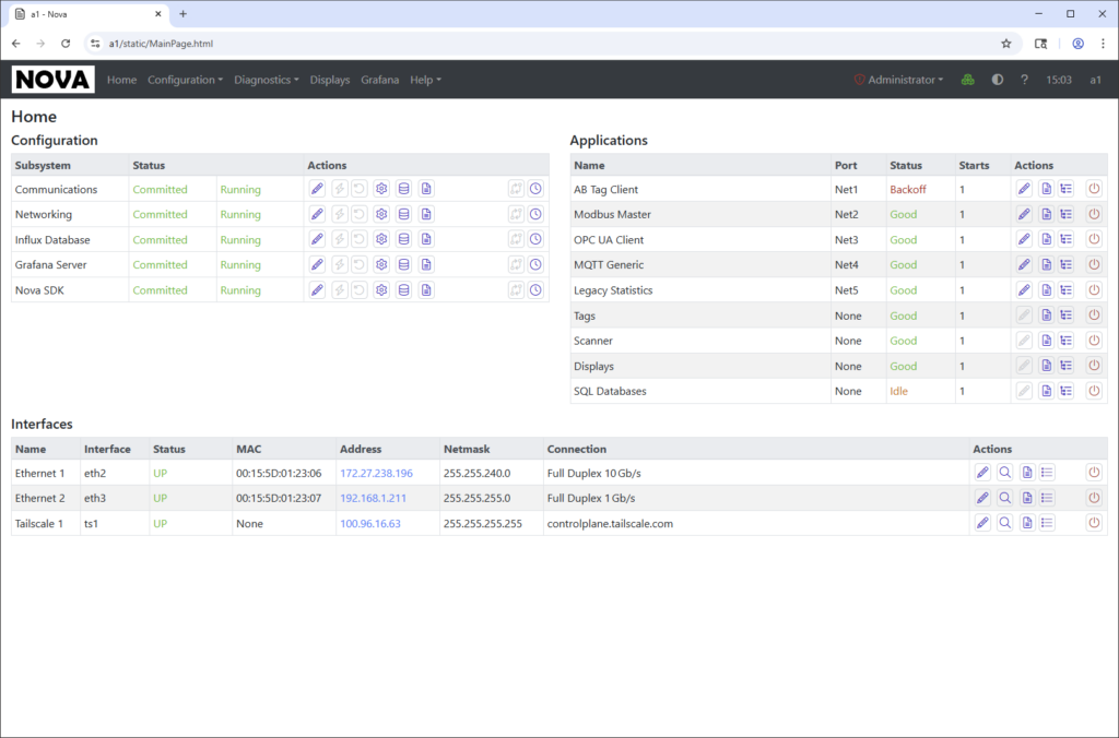 Nova can communicate with a wide variety of industrial devices, moving the resulting data to other devices, or exporting it via protocols such as MQTT and OPC UA. Integration with databases such as Microsoft SQL Server or PostgreSQL moves production data both to and from enterprise level systems, while multi-session HTML5 graphics visualize your data on either a local display or via any web browser. Nova provides powerful and secure networking facilities, including support for VLANs and VPN tunnels using modern technologies such as Wireguard and Tailscale. And if that isn’t enough the SDK subsystem allows you to host your own software or to import ready-made containers running applications like Node-RED or the Mosquitto MQTT broker.