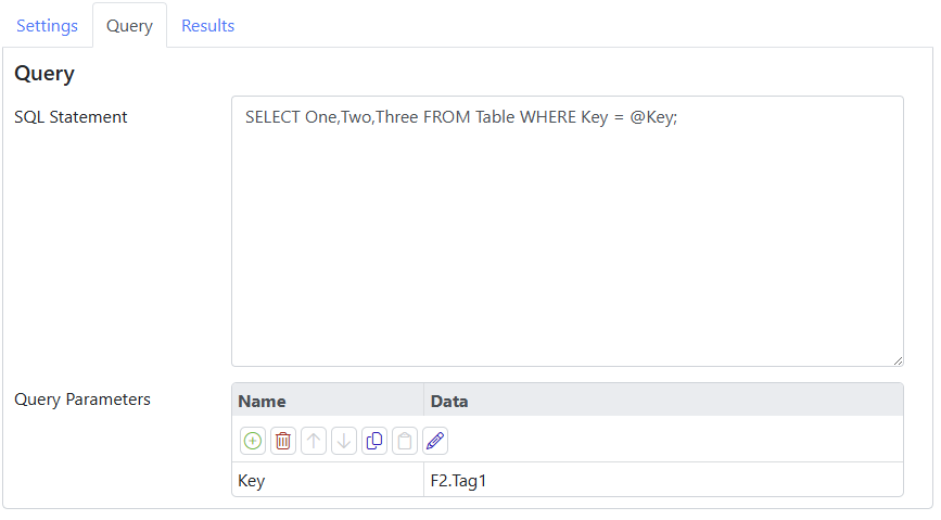 We skip the Result Data, which would normally receive the JSON array that represents the returned row set, and instead we define a number of Result Splits, each with its own JSON path and a tag in which to store the results. The initial 0/ is required since the query results always take the form of an array, even if it only contains one row, and we must thus select the first row if that is what we want. The balance of the path selects the column that we want, allowing each column to be stored in its own tag.