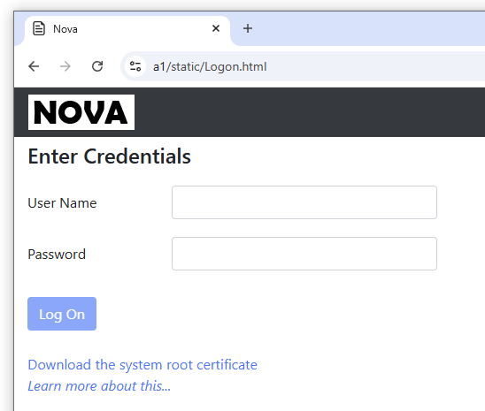After you have installed the certificate, close any active browser windows and then navigate once again to the Nova log on screen. The certificate error should now have been removed.