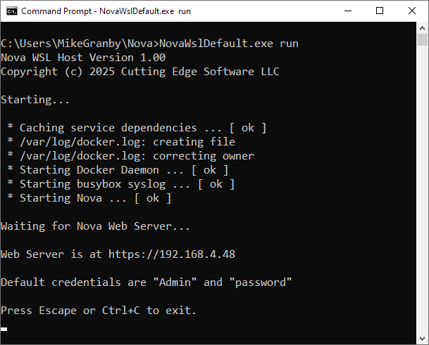 Once you have installed and registered Nova, you can run it by opening a command prompt, running the cd Nova command to change to the Nova subdirectory, and then running the WslNovaDefault run command. The command will take a little longer the first time it is executed, but after a delay, the it will print the IP address of the Nova instance and open the Nova web interface in your default browser.