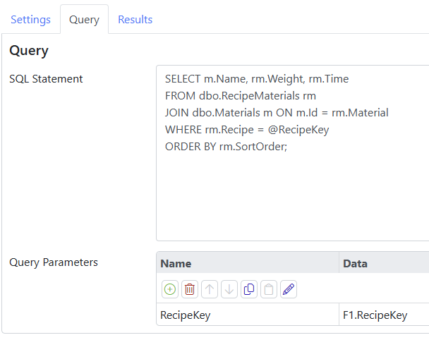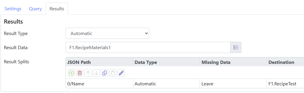 The Results tab is used to define what should be done with the results of the query. Queries that return only a single string or number can store that result in a string or numeric tag, defined by the Results Data setting. That said, most queries return one or more rows of data, and Nova handles this by converting the data to a JSON object or array and storing it as a string. Nova contains powerful JSON manipulation techniques that are described in this article. The same article describes how to use the Result Splits table to parse the JSON into sub-objects or values that can be stored in other tags.