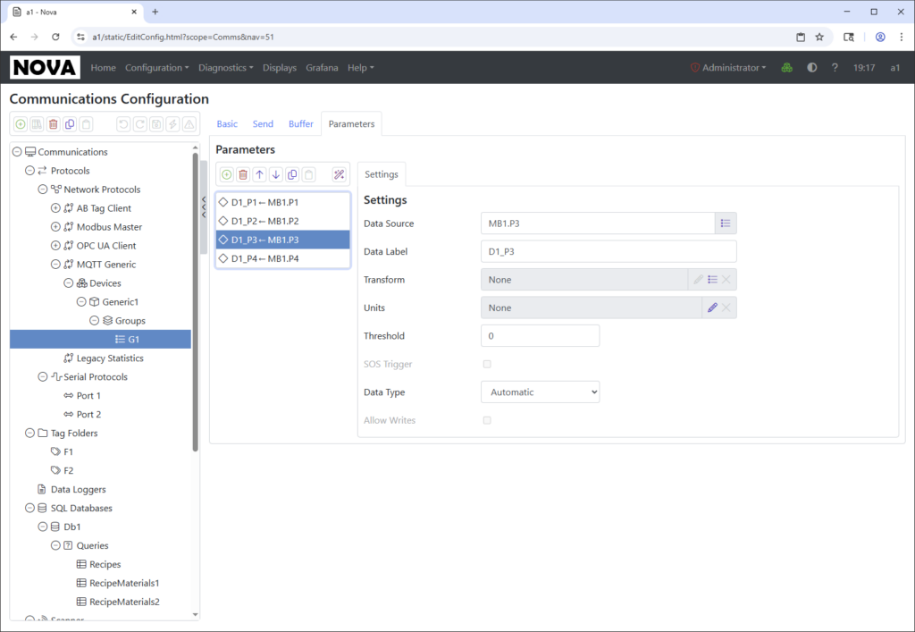 On the northside, Nova can pass data to enterprise systems using MQTT in JSON or Sparkplug format, or over connections to database servers like Microsoft SQL Server or PostgreSQL. For sites with intermittent connectivity, Nova can buffer gigabytes of data, replaying it upon reconnection to ensure that no data is lost.