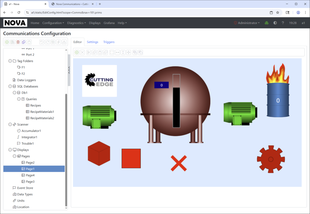 Nova’s visualization system allows you to create HTML5-based pages to display your process status. Integration with Software Toolbox’s Symbol Factory provides Nova with a rich set of scalable SVG symbols, all of which can be recolored according to your process data. The rich editor operates entirely within your web browser, and pages can even be edited from the device manager. Tabular primitives allow the display of multiple tags with just a few clicks, and can even take a JSON array or object and construct a table based on its contents. This last feature allows a PLC UDT or the results of a SQL query to be displayed with a single primitive.